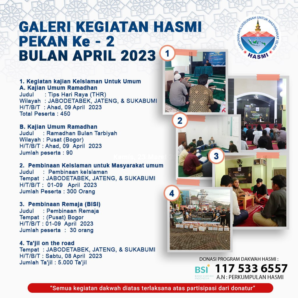 Alhamdulillah berkat doa dan donasi dari para dermawan telah terlaksana beberapa Kegiatan Dakwah HASMI, yang dilaksanakan di wilayah Jabodetabek, Bandung, Sukabumi dan Jawa Tengah